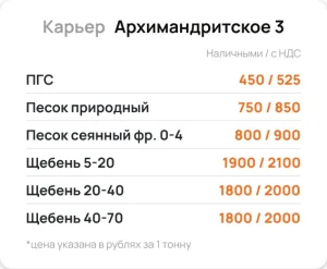 Стоимость материала + доставки рассчитывается индивидуально и зависит от выбранного карьера и расстояния до вашего объекта. Итоговую стоимость вы получите от менеджера за 10–15 минут.